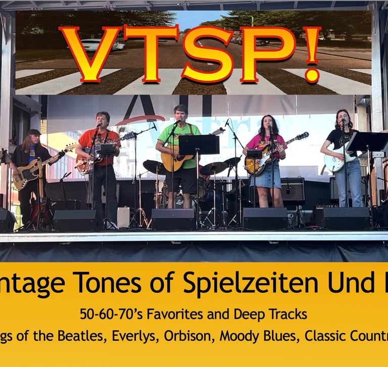 The Vintage Tones of Spielzeiten Und Pausen (aka VTSP) focuses on playing 50-60-70s favorites and deep tracks featuring songs of The Beatles, Everly Brothers, Roy Orbison, Moody Blues, ELO, CCR, Grateful Dead, Emmy Lou Harris, Classic Country, and Rockabilly. We have an extensive song list that highlights our vocal harmonies as well as our vocal soloists